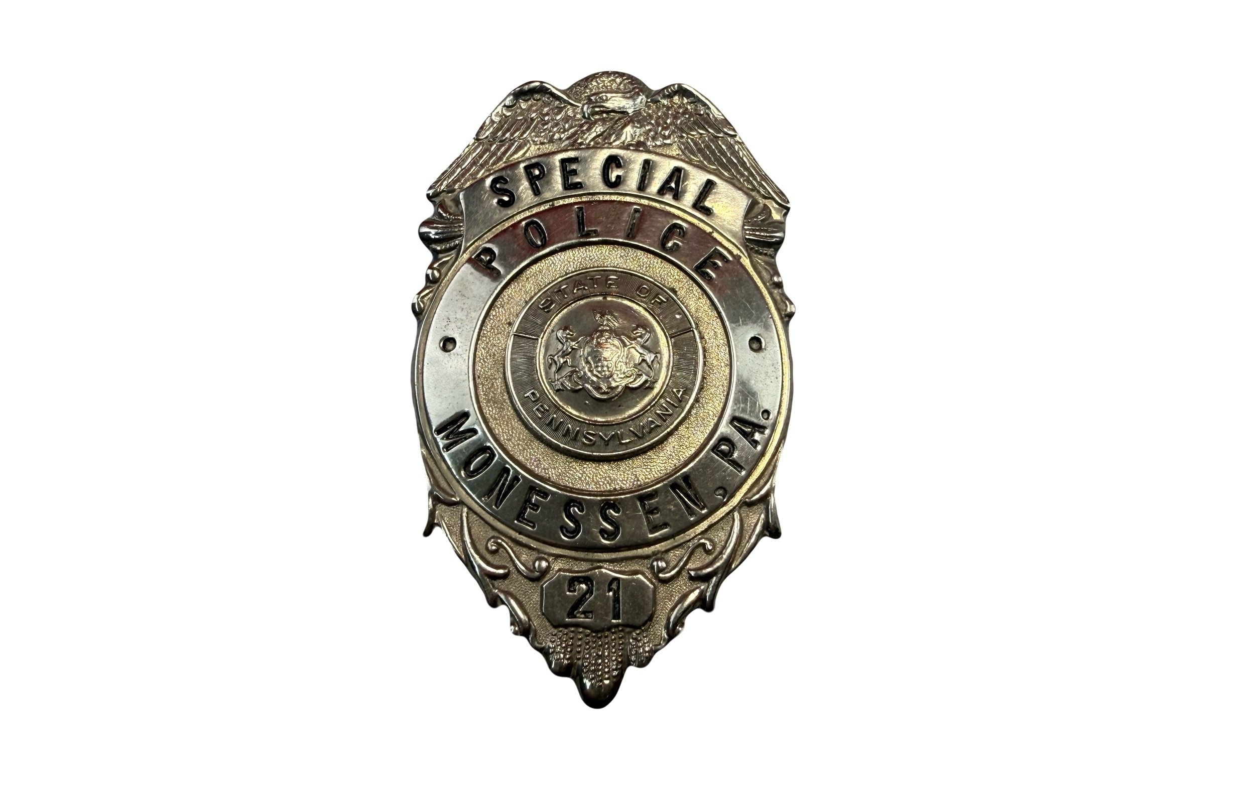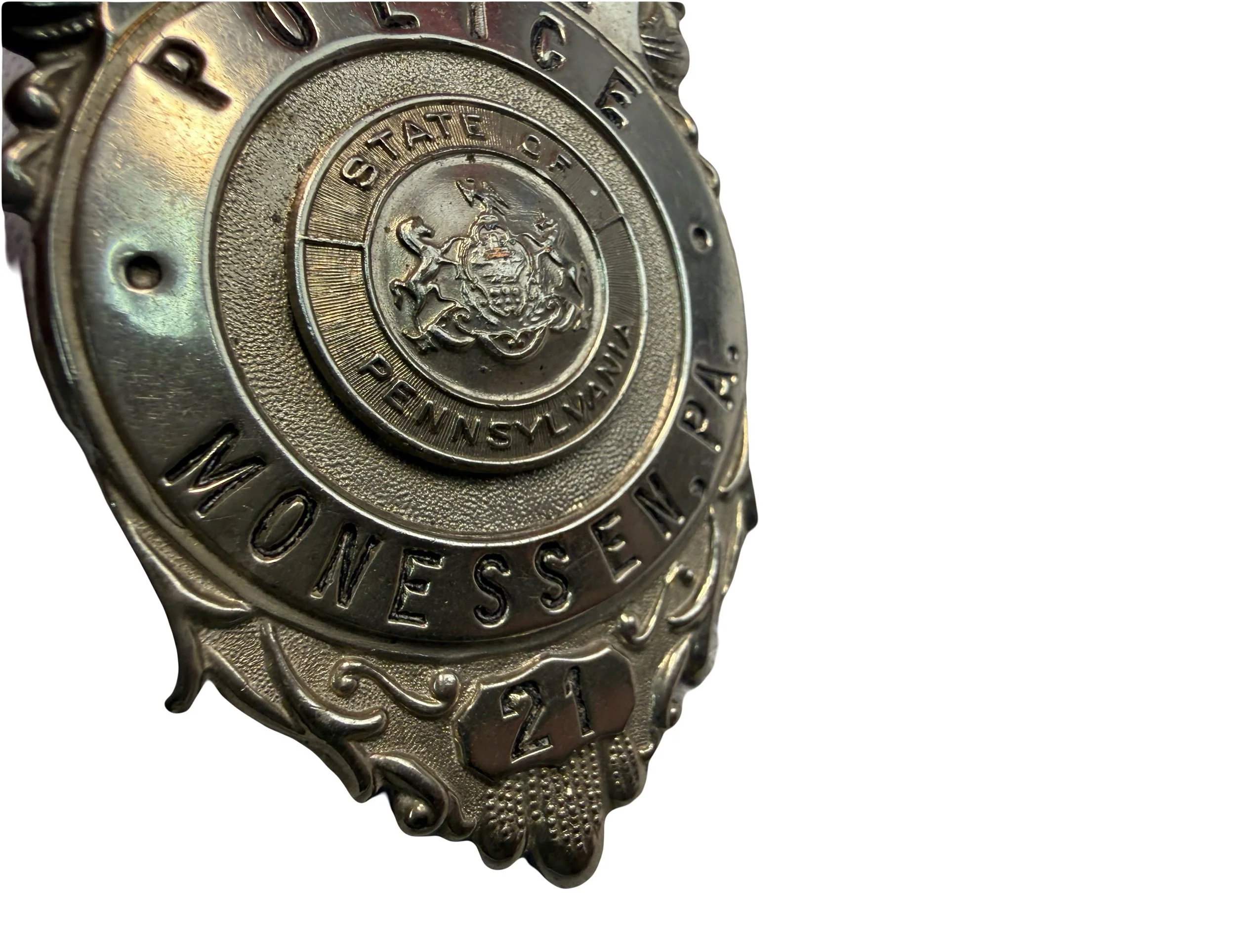 Offered here is a very nice example of a vintage Monessen PA police badge. This badge is nicely numbered to officer #21. Overall the badge is in great condition and will display well!