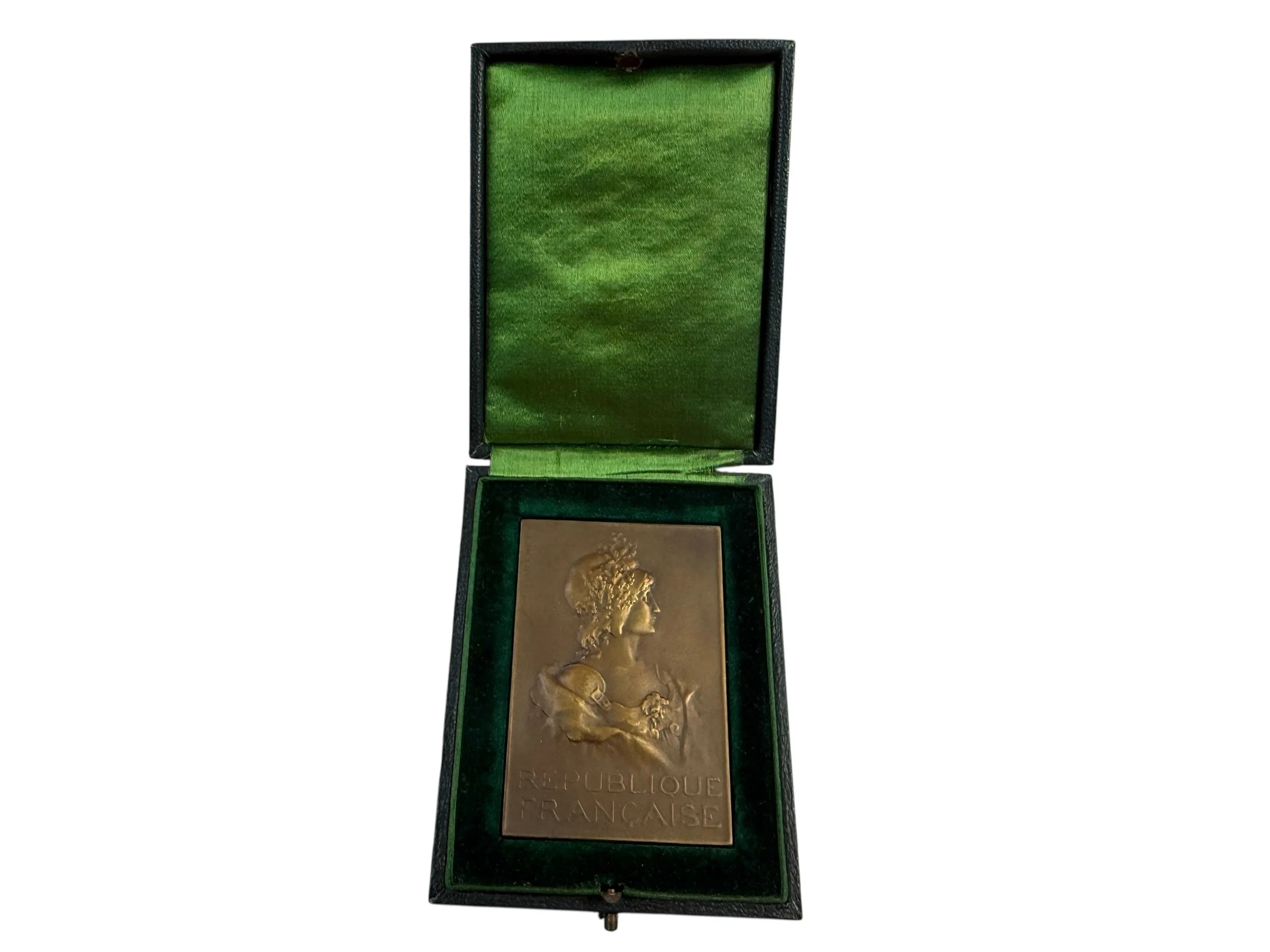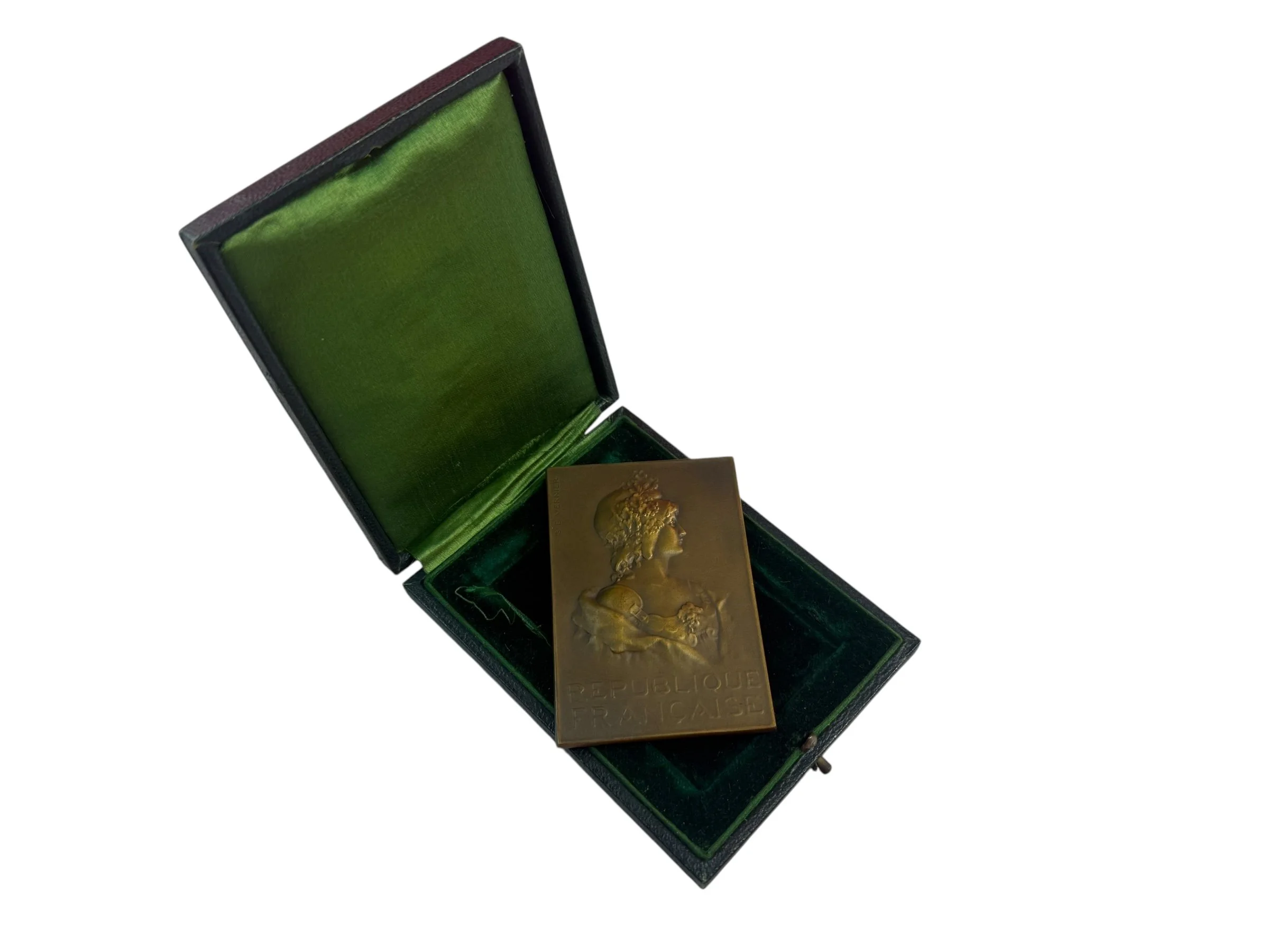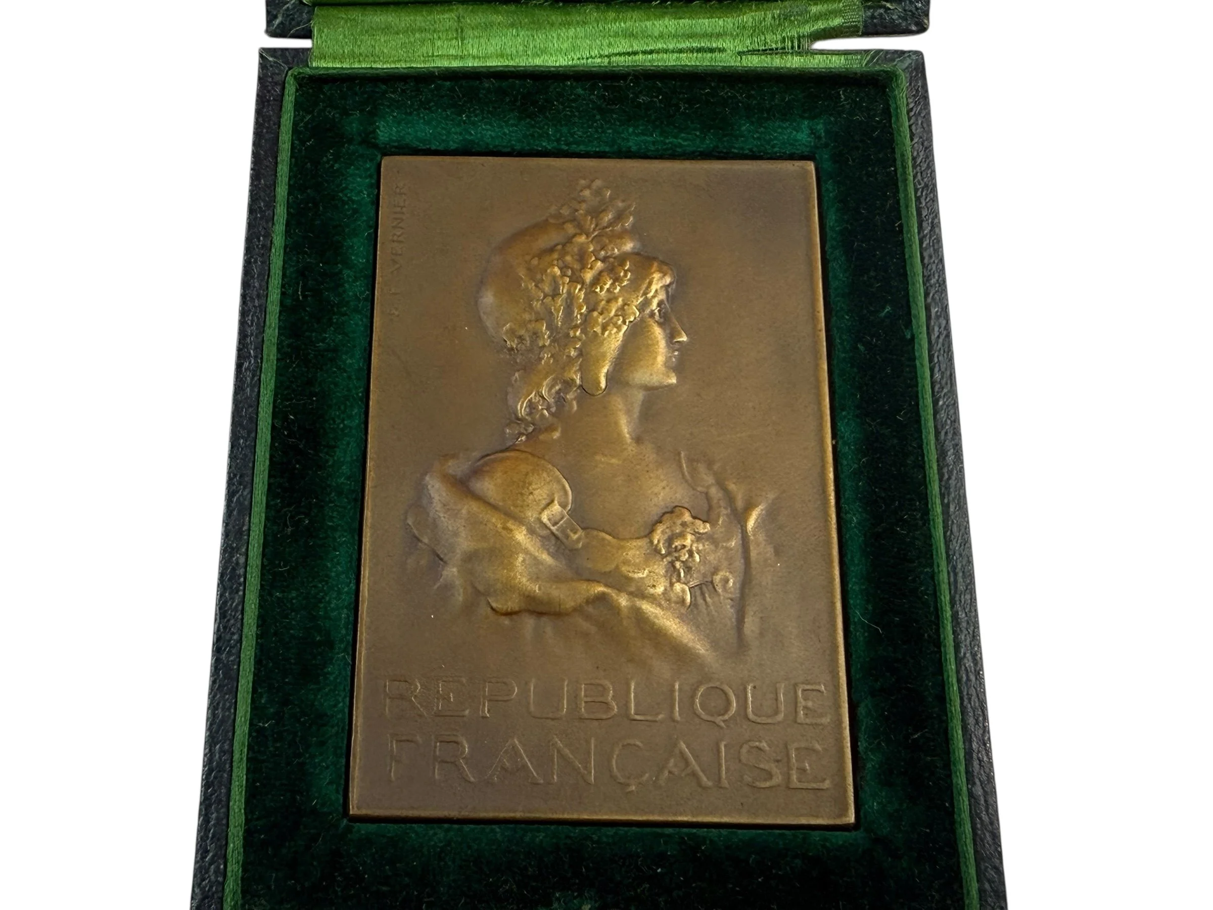Offered for sale is this very beautiful and historically significant bronze table medal. These table medals were commissioned by the French Republic to be awarded to those American diplomatic officials who worked together with the French delegation to Washington D.C. in 1919. The French sent their mission to the United States to discuss the upcoming Treaty of Versailles.