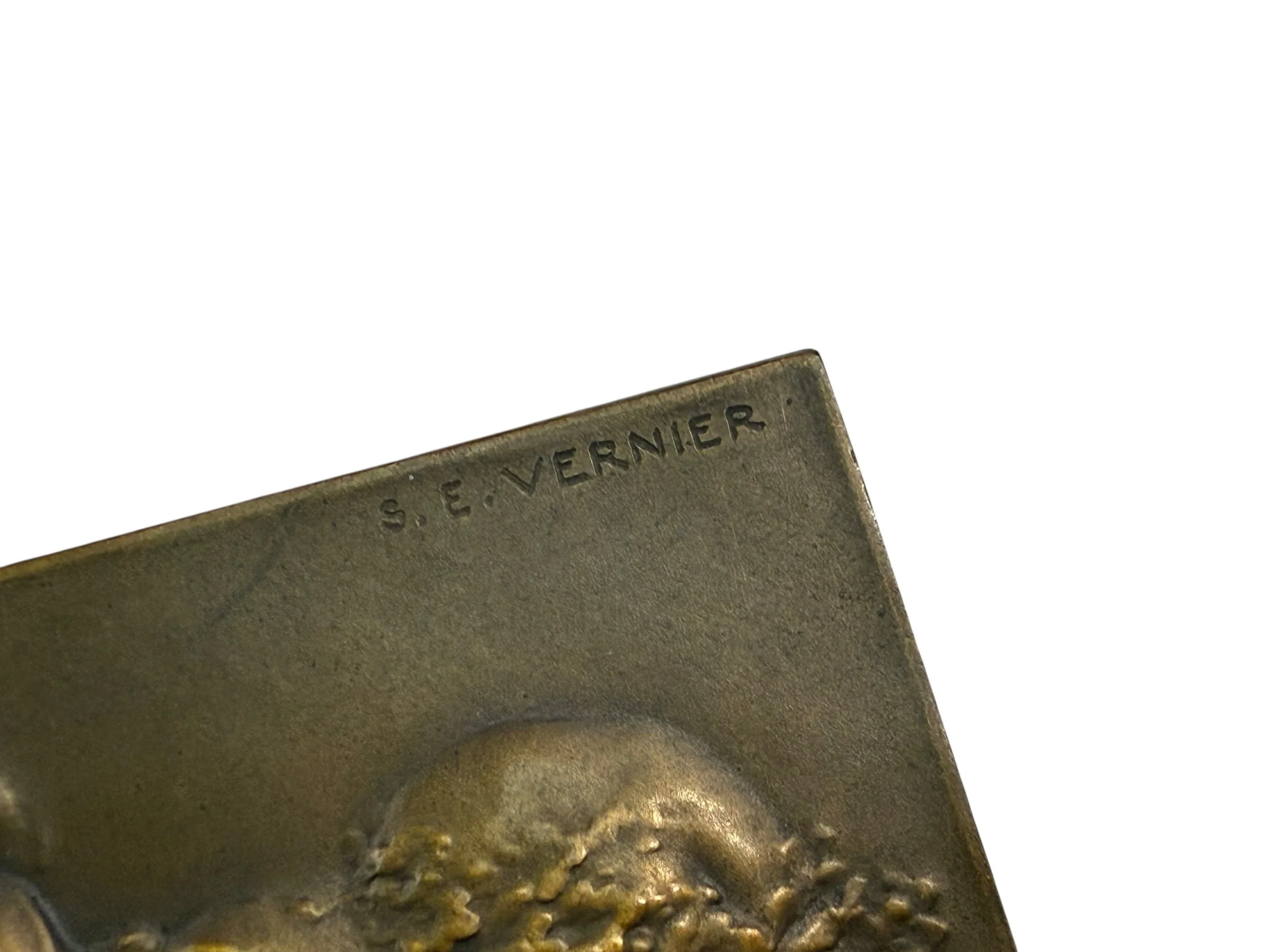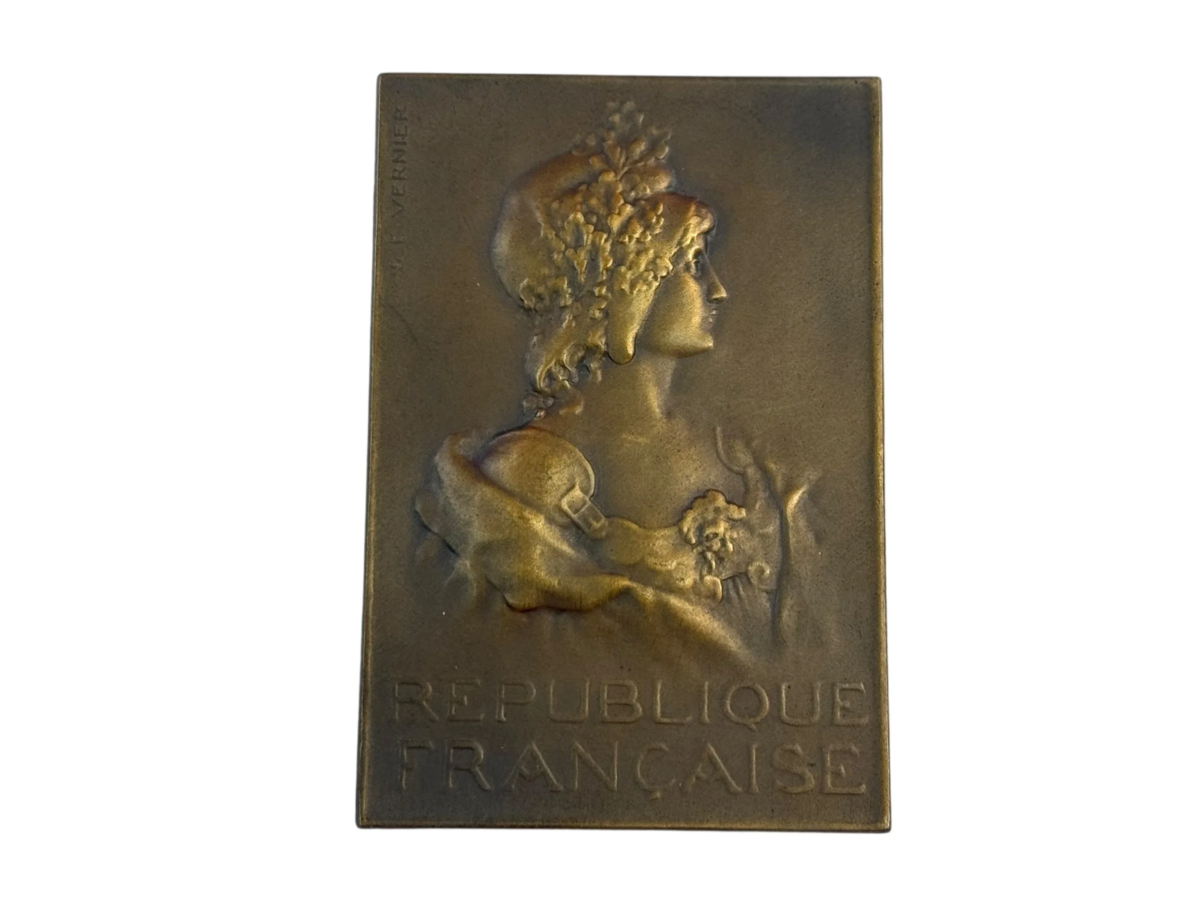 The obverse of the medal features a prominent effigy of the “French Marianne”, the national personification of the French Republic. The medal is stamped “BRONZE”, and bares the inscription “S.E. VERNIER”. Emil Seraphin Vernier was a French artist, sculptor, metal worker and engraver for much of his life. Vernier was a distinguished sculptor and was commissioned by the French government to make numerous plaques. Vernier was commissioned to make many of these similar looking plaques, but I have only seen one or two others that commemorate the French diplomatic mission in 1919.
